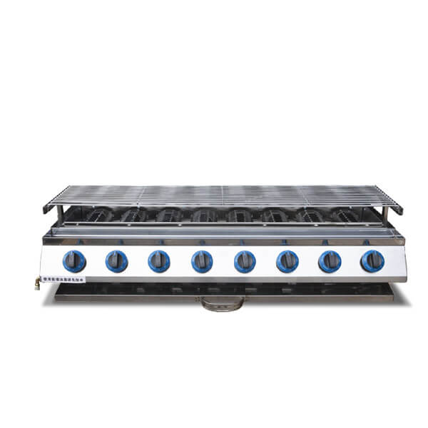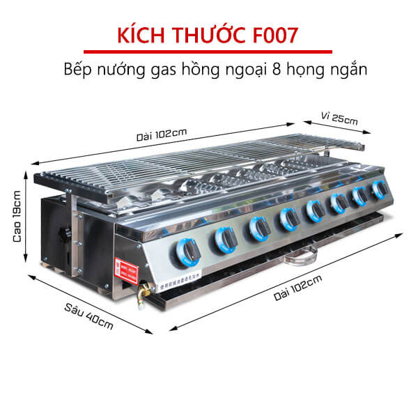 Bếp nướng gas 8 họng đốt ngắn F007 được thiết kế dành riêng cho các nhà hàng, quán nướng. Sử dụng chất liệu Inox 201, bếp có bề ngoài sáng bóng, hoạt động bền bỉ và chắc chắn, không bị ăn mòn. Bếp sử dụng công nghệ đốt hiện đại, điều chỉnh được từng họng đốt riêng biệt, giúp tiết kiệm gas và tăng năng suất nướng.