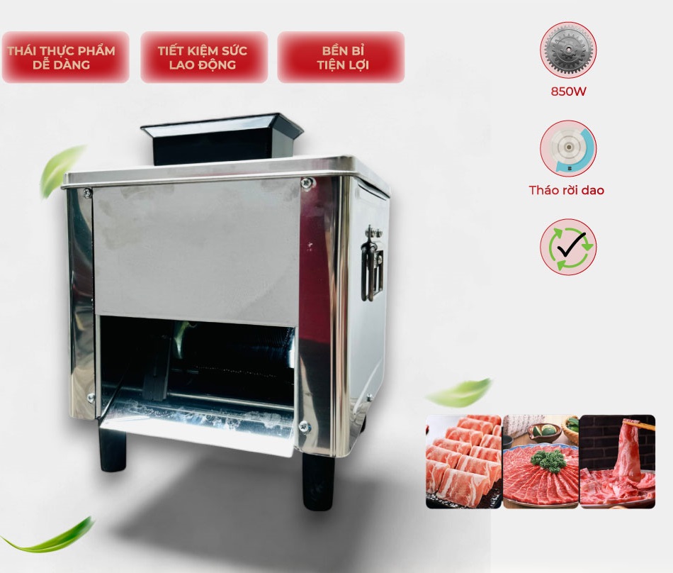 Máy này sử dụng lưỡi dao hình tròn để thái thịt được thả từ trên xuống, cho phép xử lý đa dạng loại thịt như thịt bò, thịt lợn, thịt dê và một số loại rau củ. Lưỡi dao được sắp xếp xen kẽ cố định để đảm bảo lát cắt đều và không bị kẹt thịt.